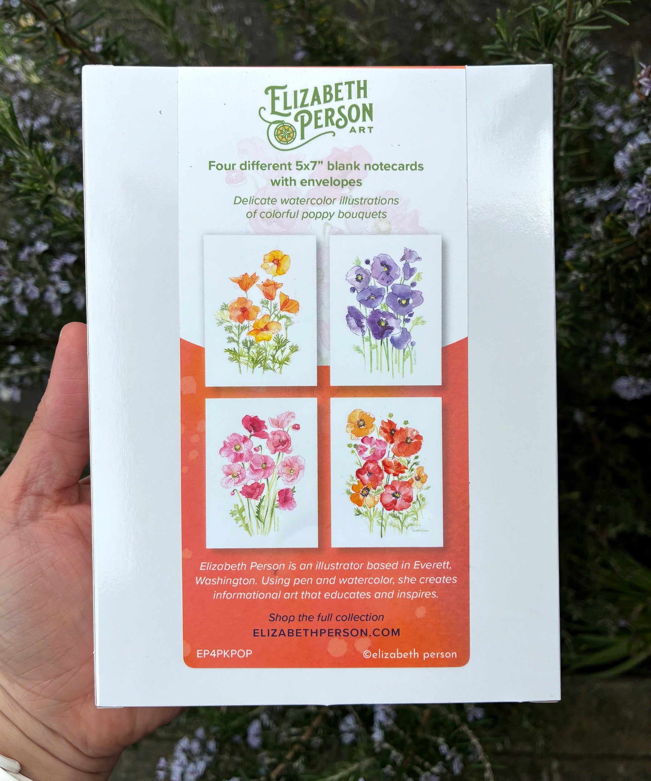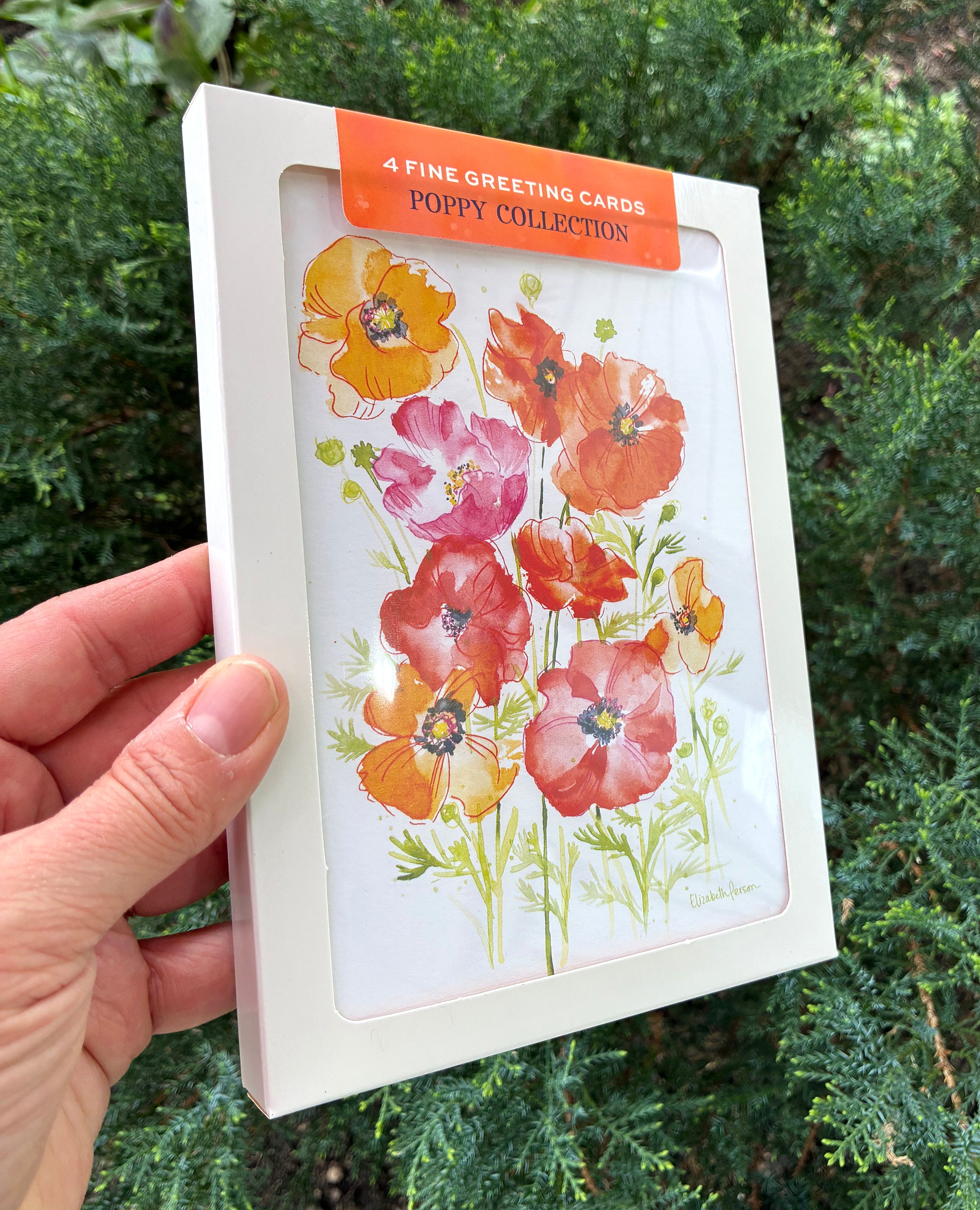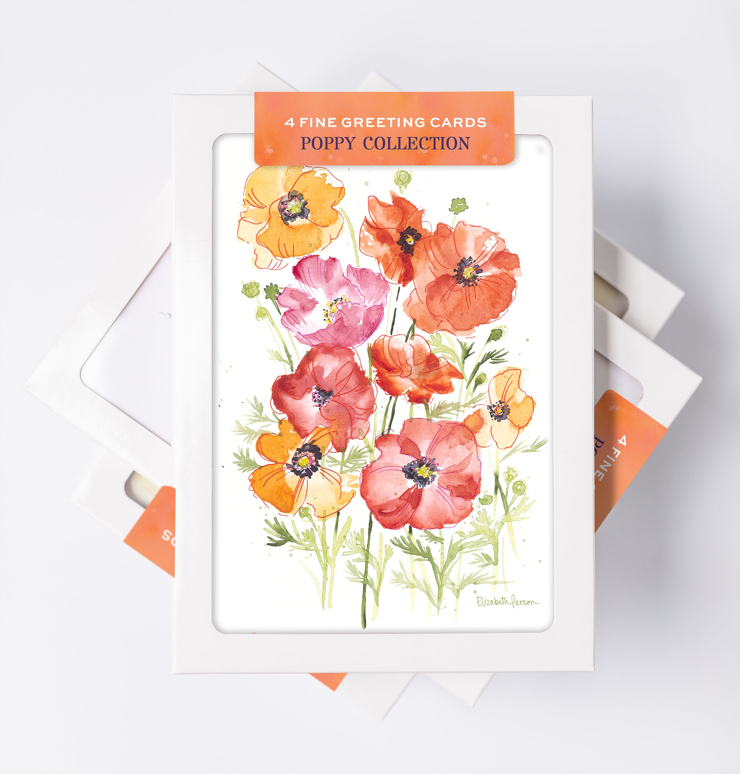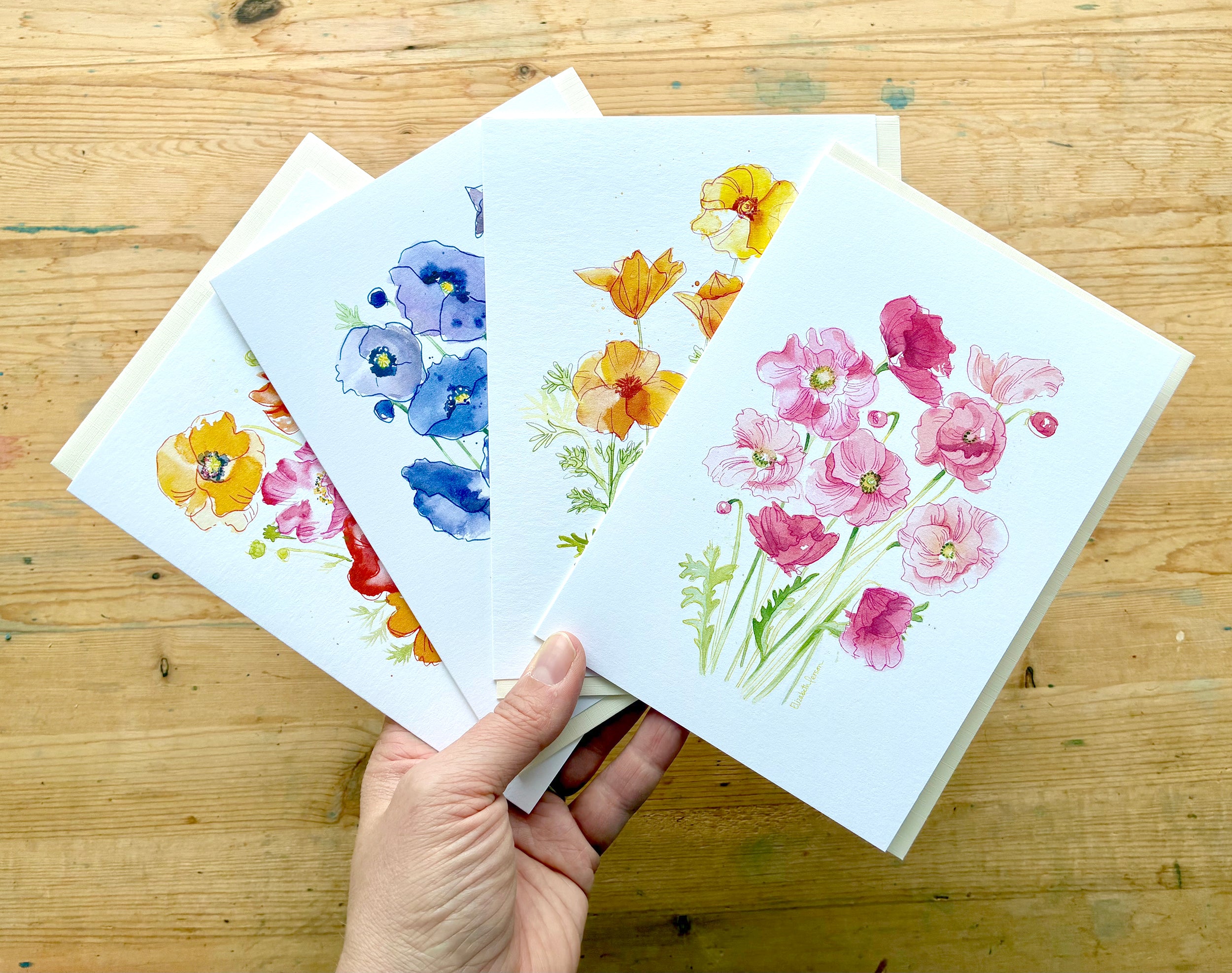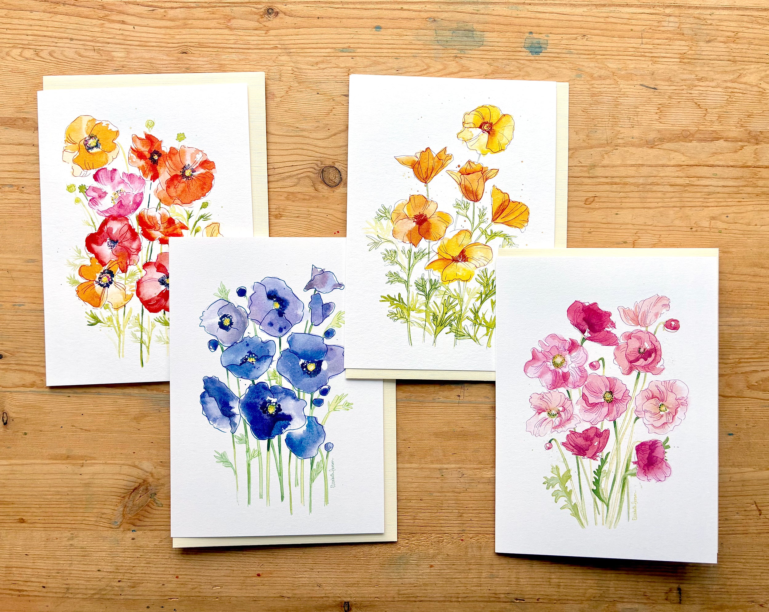 Send flowers that won’t wilt away! Each bouquet includes four blank cards featuring watercolor illustrations inspired by delicate, colorful poppies. Each "card bouquet" includes all four unique designs.