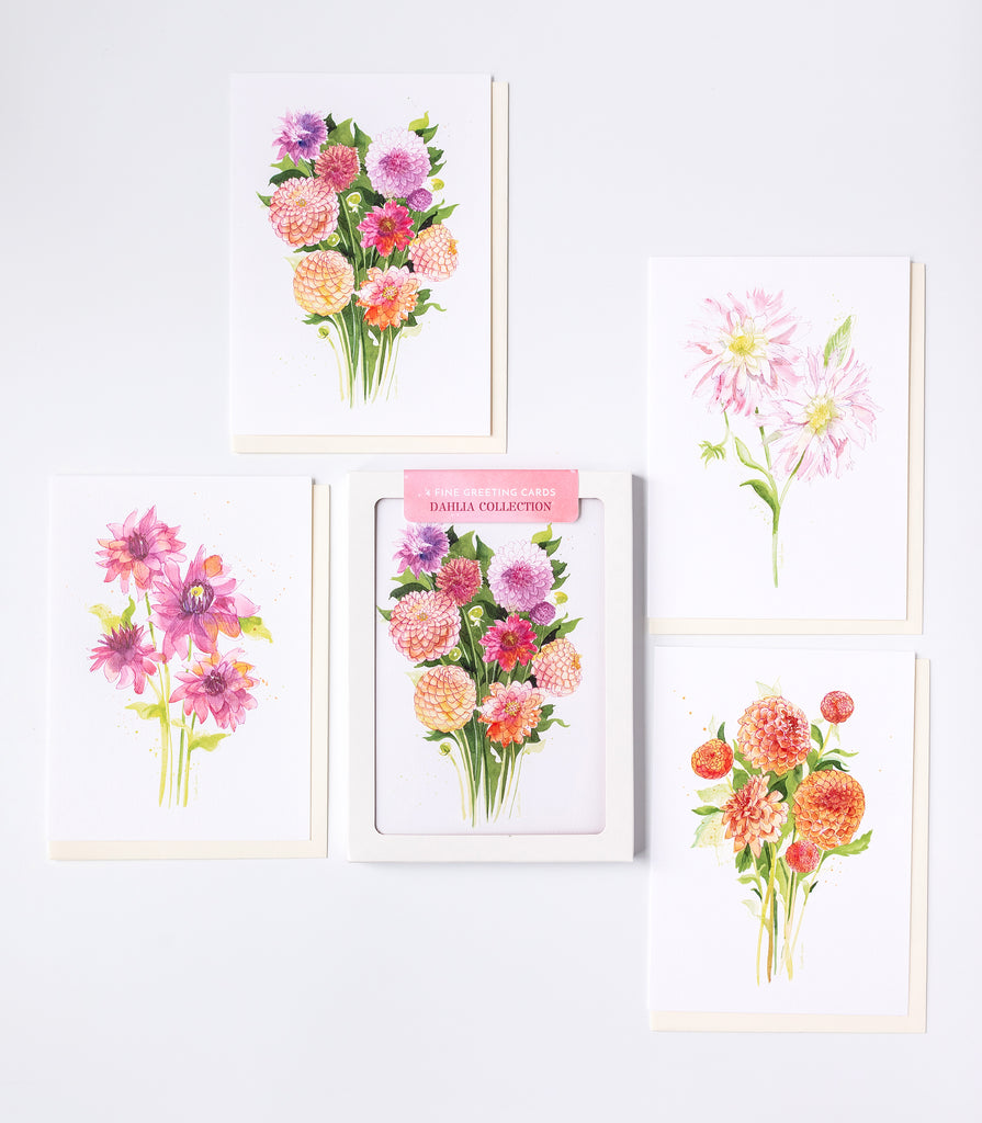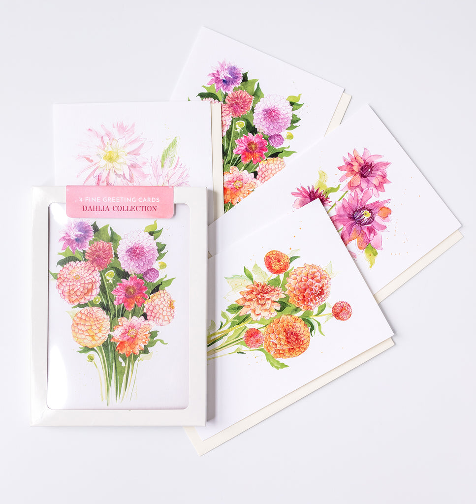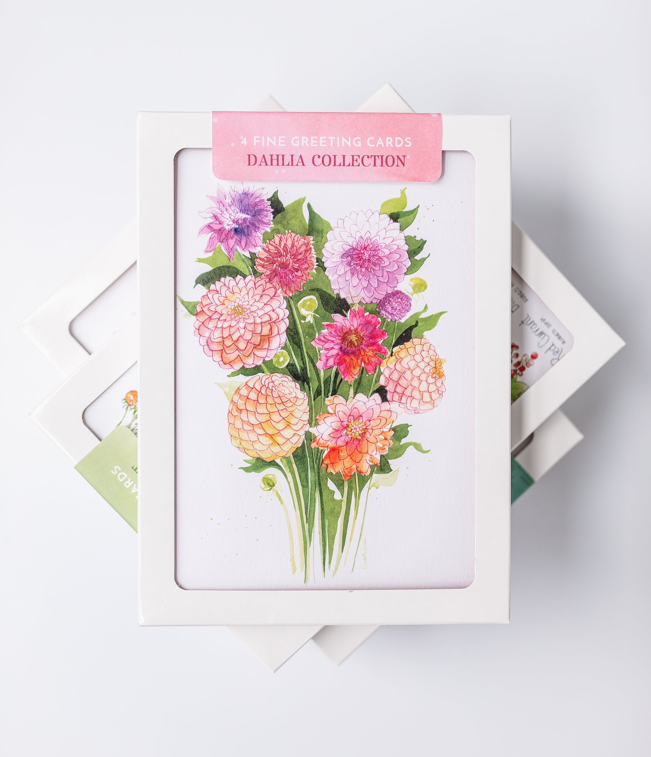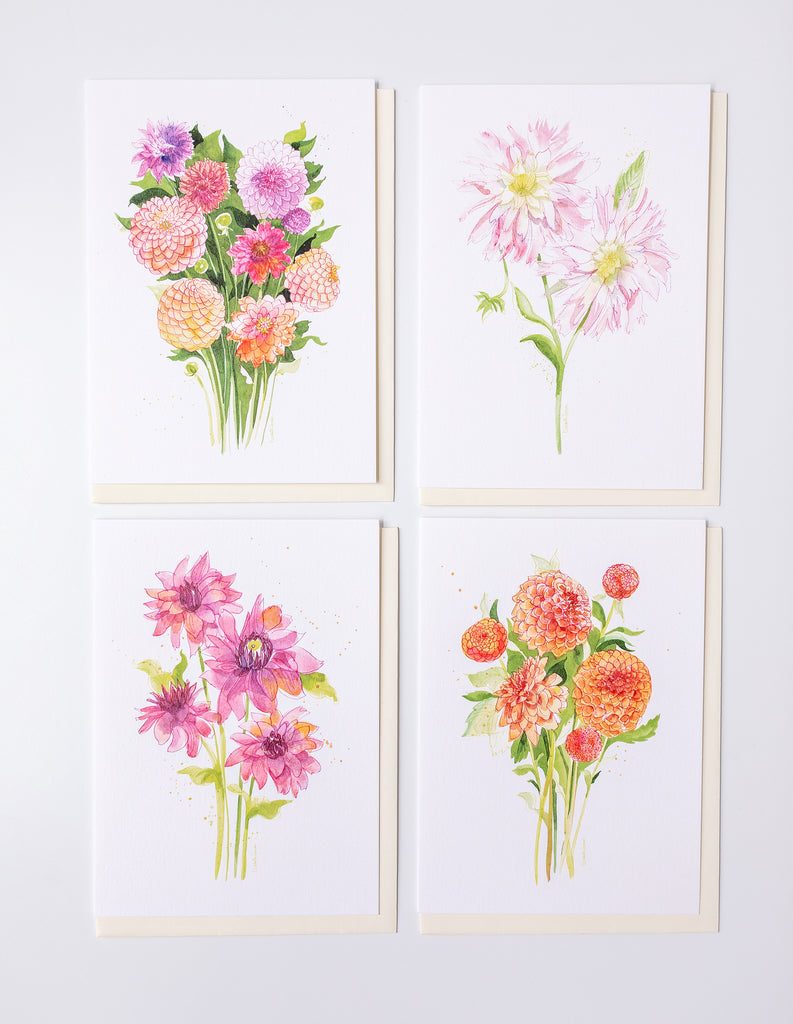 Send flowers that won’t wilt away! Each bouquet includes four blank cards featuring watercolor illustrations inspired by the incredible late-summer blooming dahlia. Each "card bouquet" includes all four unique designs.