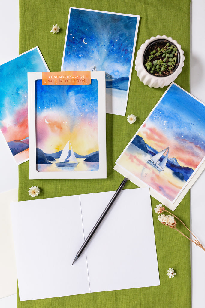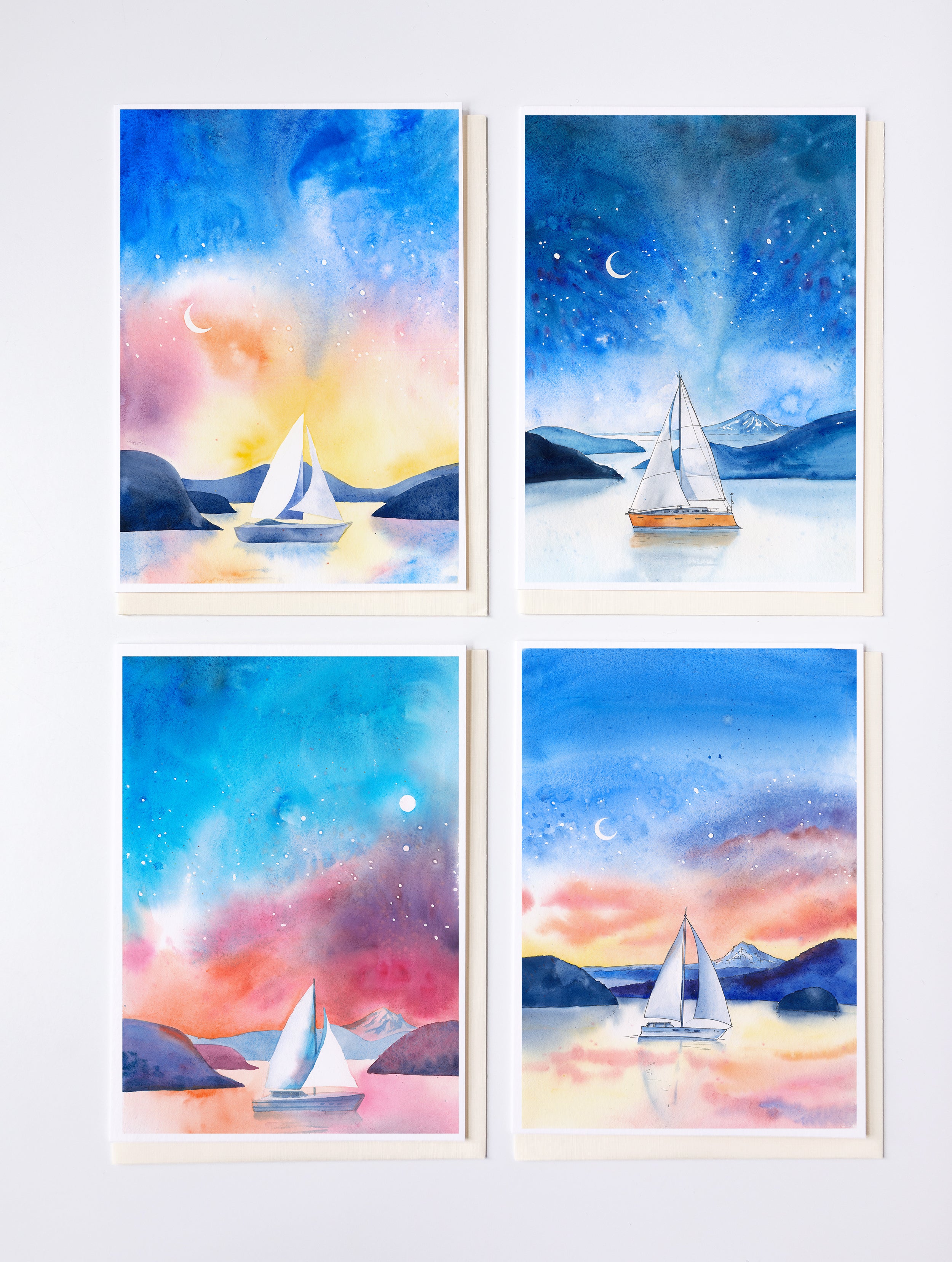 This boxed pack of greeting cards features four charming illustrations of sailboats, inspired by the Anacortes area specifically and the PNW in general. Each design is a print of one of my original illustrations.