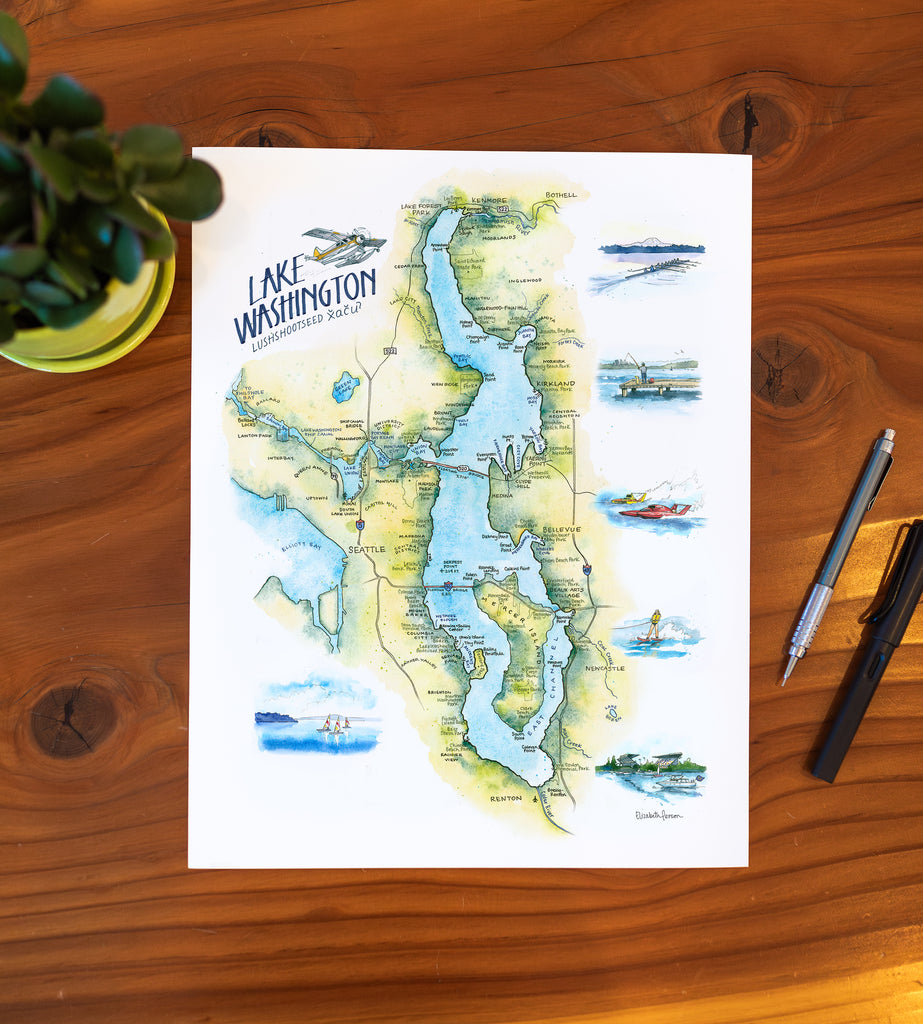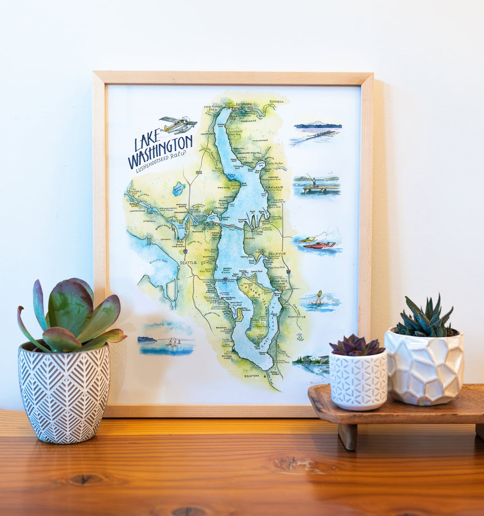 Vignettes of lake life circle the map: a float plane, sailboats, UW "sailgating" at the University of Washington Huskies football games, waterskiing, hydroplane races (a Seafair anchor event), fishing off a dock and a rowing crew in the early morning light.