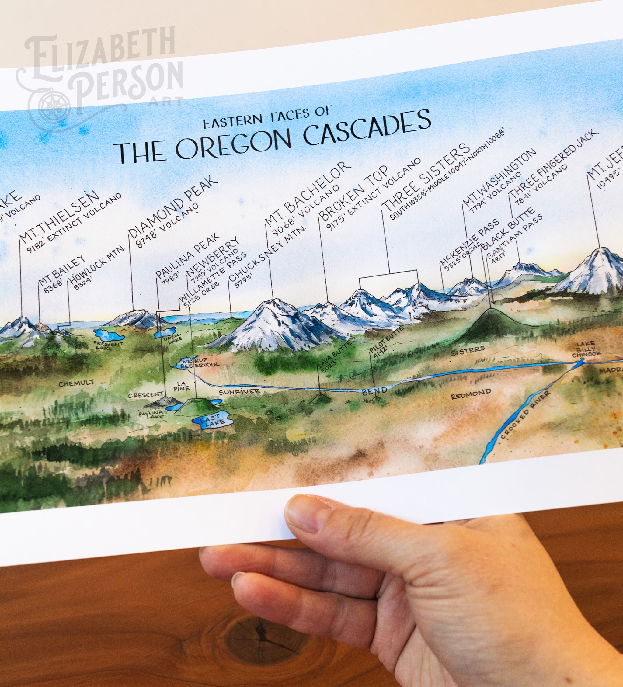 This piece is from the perspective of Central Oregon - roughly Bend, OR - looking WEST at the Cascade Mountains. The full Cascade Range extends from British Columbia south to Northern California... this piece captures all the prominent peaks of Oregon and its neighboring states. Notable landmarks include: Klamath Falls, Mt McLoughlin, Crater Lake, Mt Thielsen, Diamond Peak, Mt Bachelor, Broken Top Three Sisters, Black Bute, Three Fingered Jack, Mt Jefferson, and Mt Hood. To see the "other side" of the mountains - the western faces of the Oregon Cascades - view my piece here.